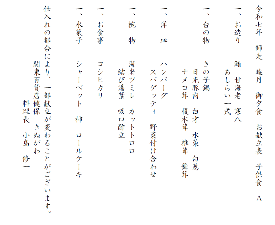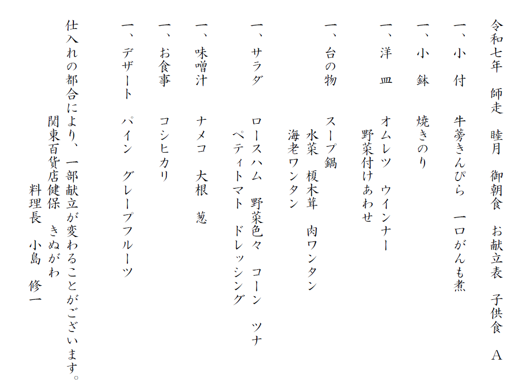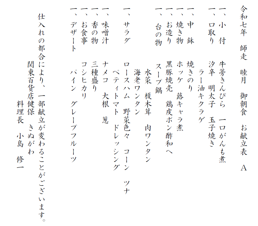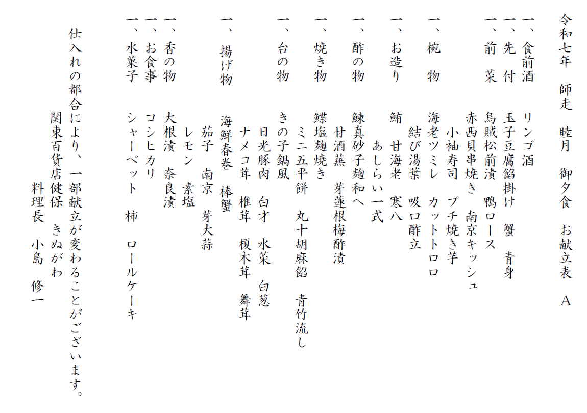 令和7年 お献立A 夕食・朝食の一例