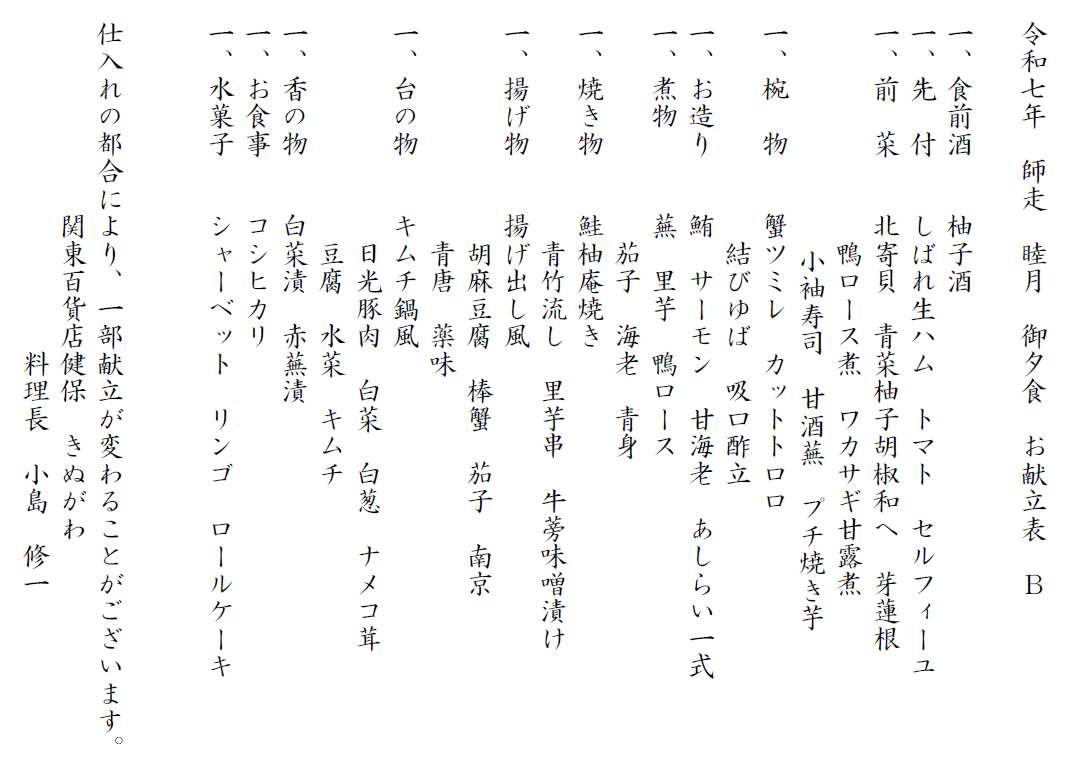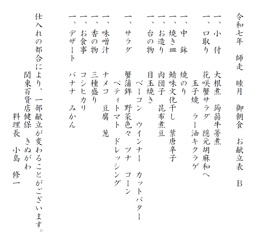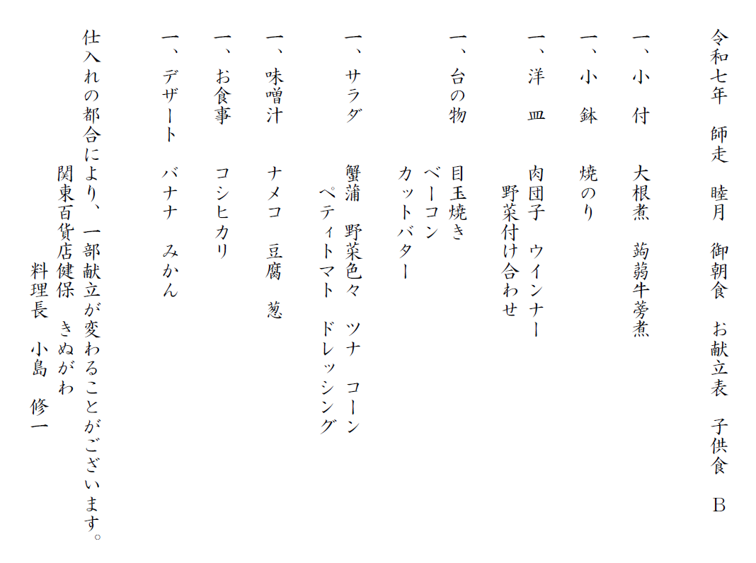 令和7年 お献立B 夕食・朝食の一例